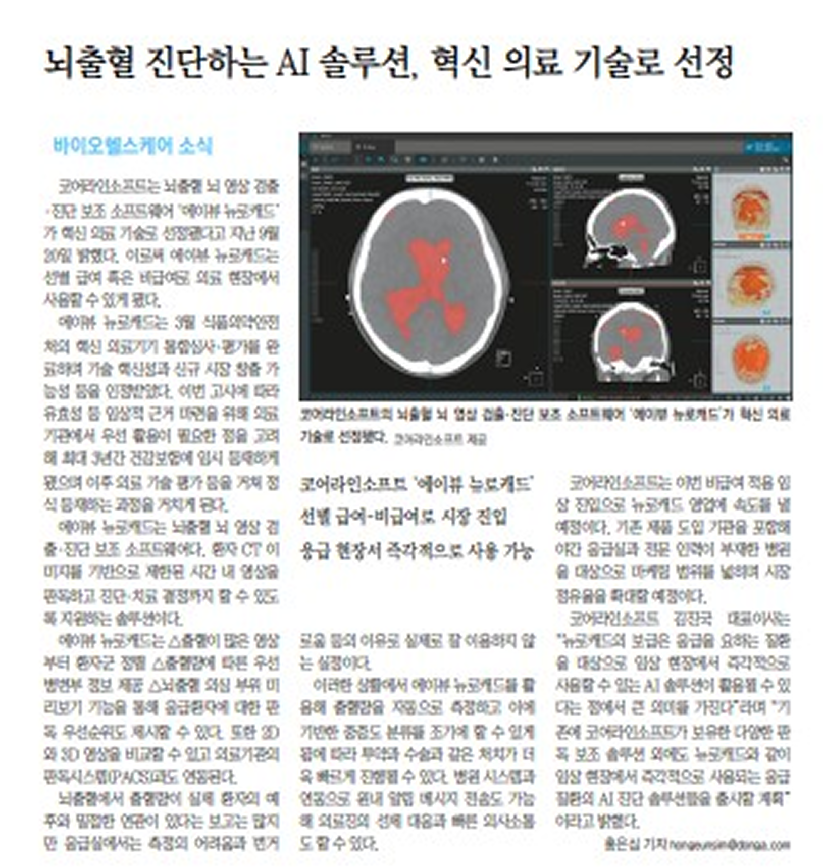 혁신의료기술로 선정된 코어라인소프트의 뇌출혈 AI 소프트웨어 'AVIEW NeuroCAD'는 응급의학과에서 뇌출혈 응급 진단을 보조하는 프로그램입니다. 이미 많은 병원에서 비교 도입 검토를 위한 세미나를 요청했고, 1차로 일산백병원, 구미차병원, 화홍병원, 세종충남대병원 등 총 16개 병원이 제품 사용을 위한 신청을 마쳤습니다.