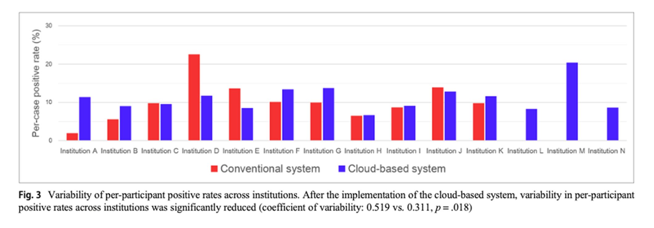 According to an NCC study comparing positive rates before and after the introduction of the AVIEW CLOUD system, inter-institutional variability decreased by